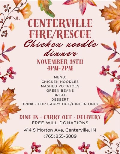 Join us on Saturday, November 15th from 4pm-7pm at Station 1 for our annual Chicken Noodle Dinner. Free-Will Offering. Come get your fill and support YOUR FIRE DEPARTMENT!